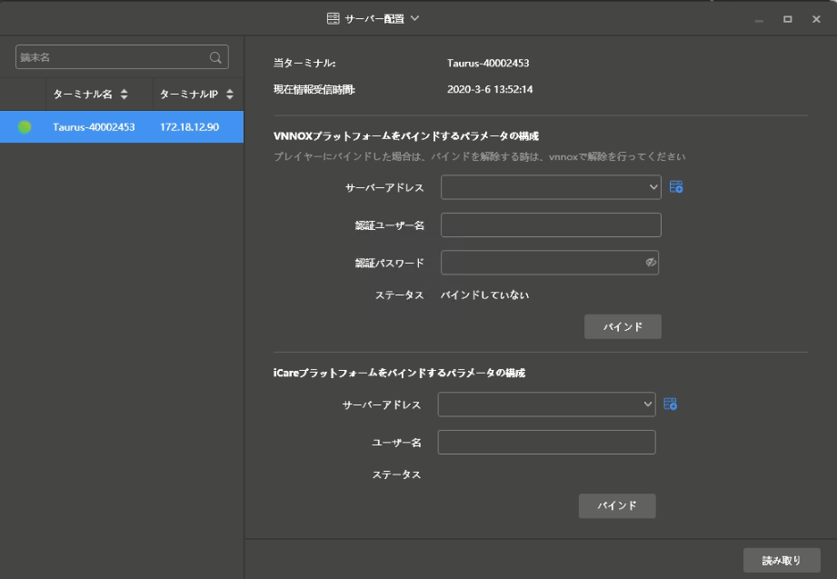 手順 9 「VNNOXプラットフォームをバインドするパラメータの構成」領域からサーバーを選択し、認証ユーザー名、認証パスワード、プレイヤー名を入力します。