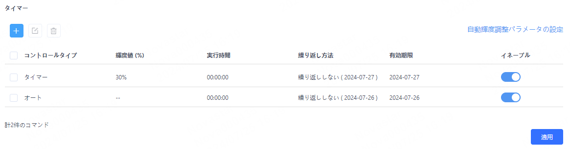 • タイマーコントロール:「タイマー」領域で をクリックし、コマンドパラメータを設定後、「確認」をクリックして「適用」をクリックします。