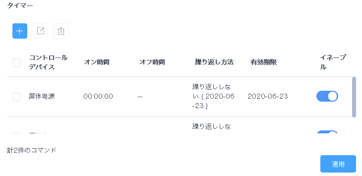 - タイマーコントロール:「タイマー」領域で、 をクリックし、コマンドパラメータを設定後、「確認」をクリックして「適用」をクリックします。