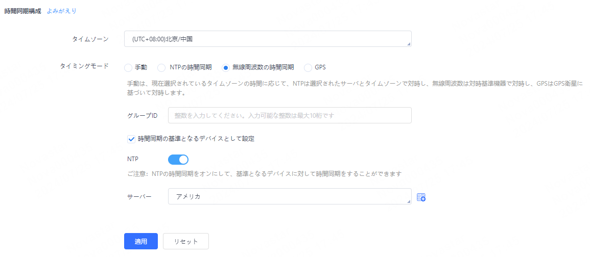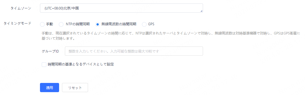 • GPSで時間同期:「タイムゾーン」を選択し、「適用」をクリックします。