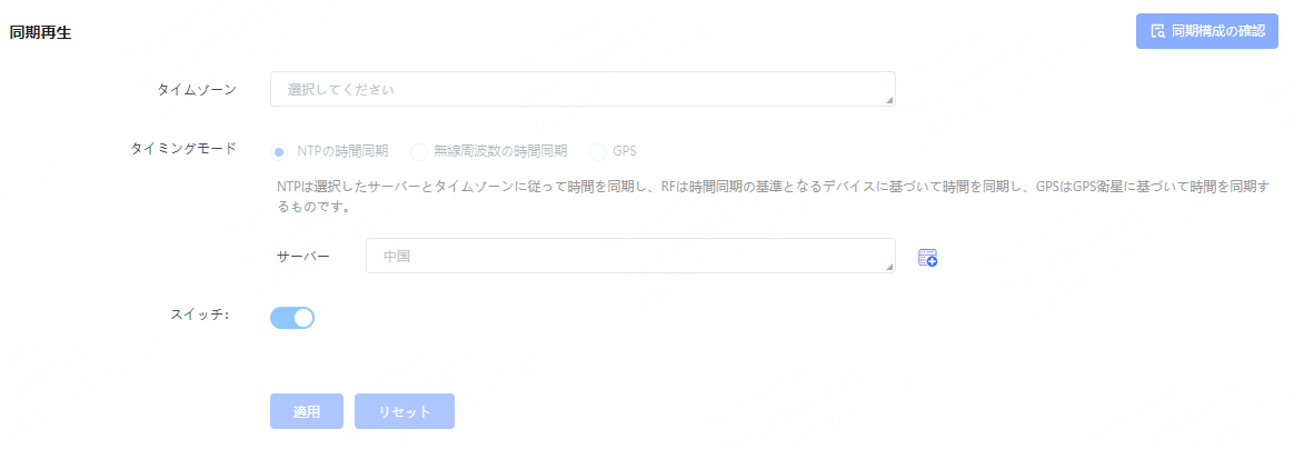 手顺 3 右上にある「同期構成の確認」をクリックし、「同期構成の確認」ウィンドウで「時間同期構成」、「デバイス情報」、「スケジュール構成」の構成情報が一致していないか確認してください。確認完了後、右下にある「レポートのダウンロード」をクリックしてレポートを確認します。
