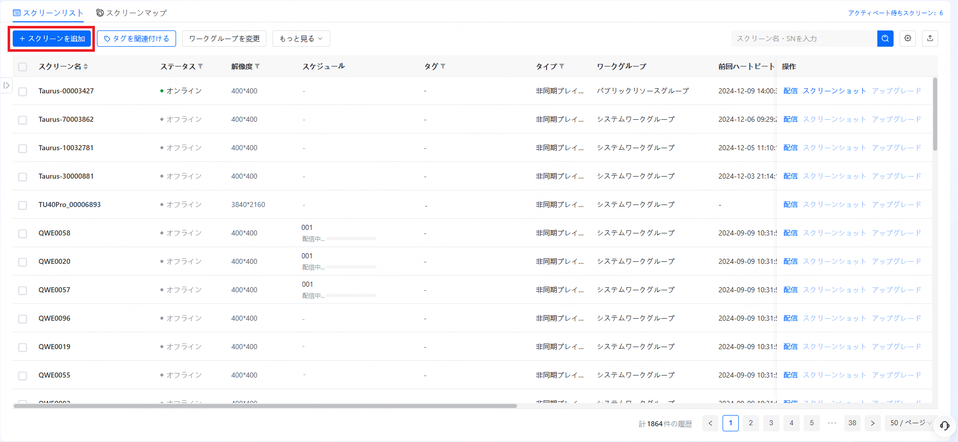 手順 1 「ワークスペース」タグから、「スクリーンを簡単に追加> 方法一:クラウドバインド > 【SN番号を入力】」を選択します。