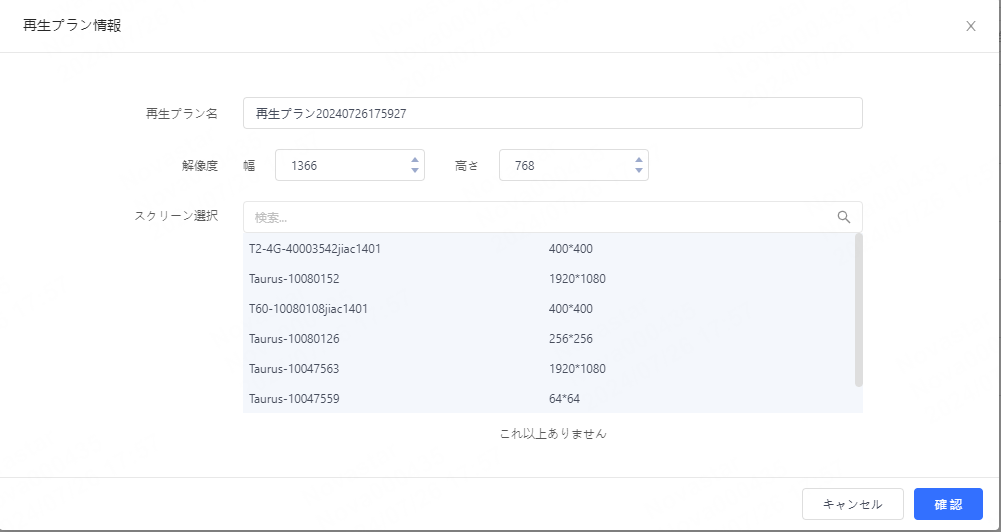 手顺 3 再生プラン名や解像度など再生プラン情報を記入し、スクリーン(任意選択)を選択して「確認」をクリックします。