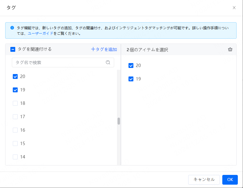 • タグを関連付ける:「タグ」ウィンドウにおいて、新しく追加したいタグにチェックをつけ、「OK」をクリックしてタグの関連付けが完了します。